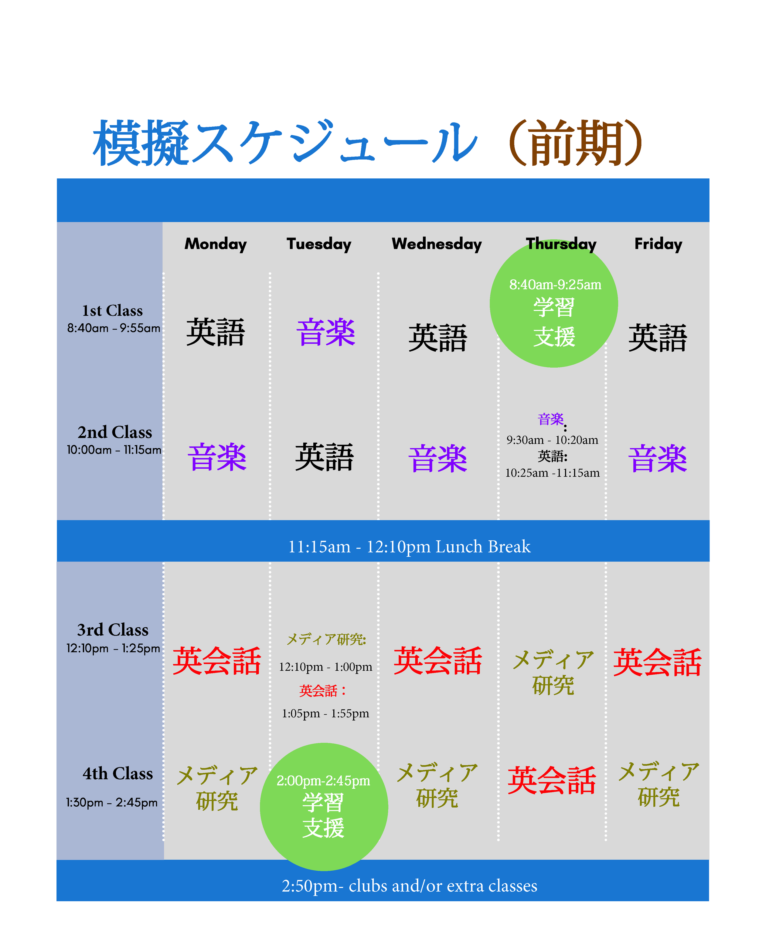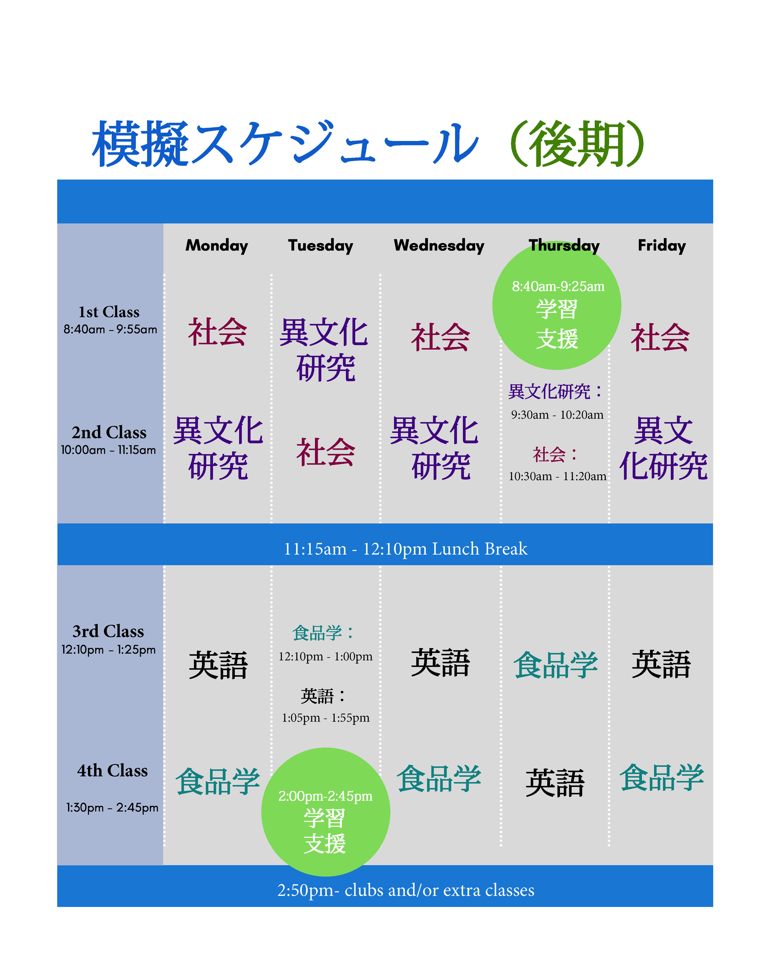 すべての留学生は、「英語」が必須科目となります。この教科は、留学生が英語力を向上させるために設けられています。また、留学生の英語力をさらに強化するために「英会話」と「異文化研究」が特別に設けられた選択教科です。自分の興味に応じてその他の教科を選択することもできます。数学、理科、社会などの学術的な教科や体育、美術、ビジネス、テクノロジー、応用技術などの勉強もできます。どの教科でも、カナダの高校生と一緒に勉強ができます。